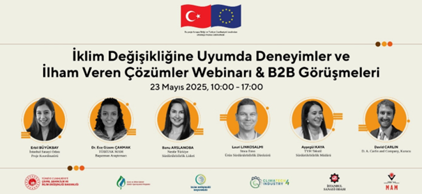 İklim Değişikliğine Uyumda Deneyimler ve İlham Veren Çözümler Webinarı 23 Mayıs 2025 tarihinde çevrimiçi platformda gerçekleştirildi. Avrupa’ daki güncel durum hakkında David Carlin bilgi paylaşımında bulundu. Gıda sektöründen Nestle Sürdürülebilirlik Lideri Banu Arslanoba, orman ürünleri sanayiinden Stora Enso Ürün Sürdürülebilirlik Direktörü Lauri Linkosalmi, tekstil ürünleri sanayiinden TYH Tekstil Sürdürülebilirlik Müdürü Ayşegül Kaya iklim değişikliğine uyum konusunda iyi örnek uygulamalarını paylaştı. Webinar, soru-cevap bölümünün ardından sona erdi ve etkinlik B2B görüşmeleriyle devam etti.