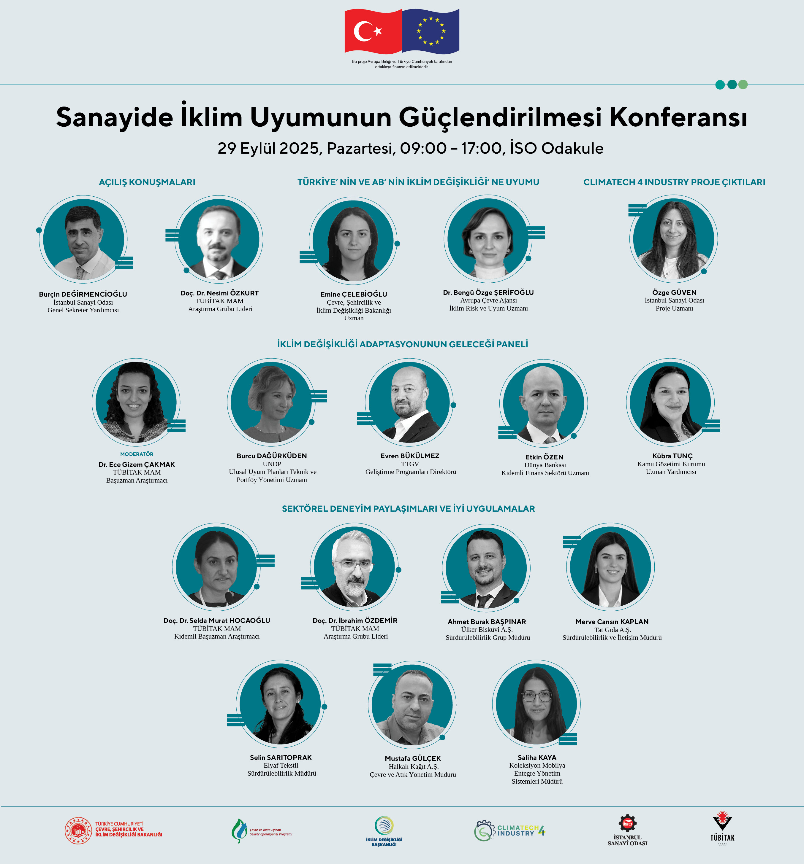 Sanayinin İklim Uyumunun Güçlendirilmesi Konferansı 29 Eylül 2025 tarihinde Odakule’de gerçekleştirildi. Açılış konuşmalarından sonra Çevre, Şehircilik ve İklim Değişikliği Bakanlığı temsilcisi Türkiye’deki mevcut durumu aktardı. Avrupa’daki güncel gelişmeler Avrupa Çevre Ajansı tarafından aktarıldı. Proje çıktıları ile beraber proje kapsamında oluşturulan Sektörel Yol Haritası Raporları ve Politika Yapıcılar için Rapor çıktıları katılımcılarla paylaşıldı. Panel oturumunda ise konuşmacılar tarafından İklim Uyumuna İlişkin Küresel Düzenlemeler, İklim Uyum Teknolojileri, İklim Değişikliğine Uyumda Finansal Kaynaklar ve İklim Risklerinin Raporlaması konu başlıklarında bilgi aktarıldı. Sektörel Deneyim Paylaşımları ve İyi Uygulamalarda AR-GE uygulamaları ve sektör temsilcileri deneyimleri paylaşıldı.