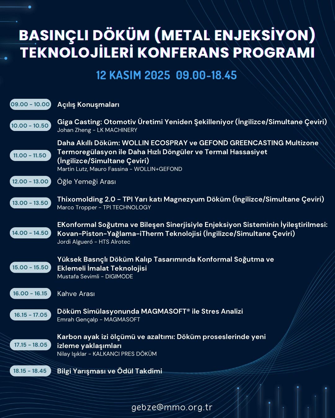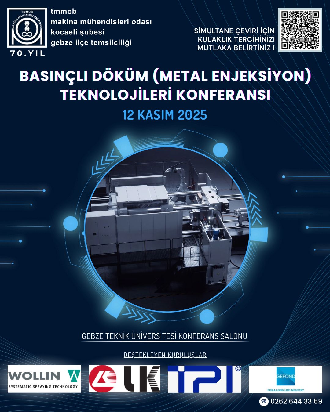 TMMOB Makina Mühendisleri Odası Kocaeli Şubesi Gebze İlçe Temsilciliği tarafından düzenlenen “Basınçlı Döküm (Metal Enjeksiyon) Teknolojileri Konferansı”, 12 Kasım 2025 tarihinde Gebze Teknik Üniversitesi Konferans Salonu’nda gerçekleştirilecektir.