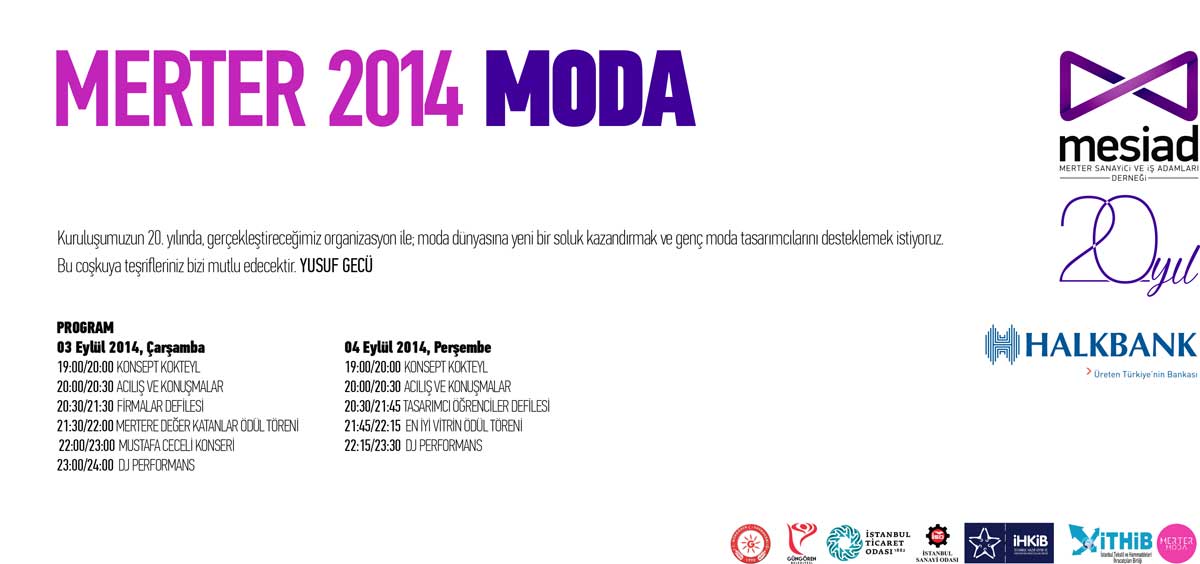 MESİAD tarafından 3-4 Eylül 2014 tarihlerinde MERTER 2014 MODA etkinliği düzenlenecektir. Detaylı bilgiye www.mesiad.org.tr adresinden ulaşabilirsiniz.