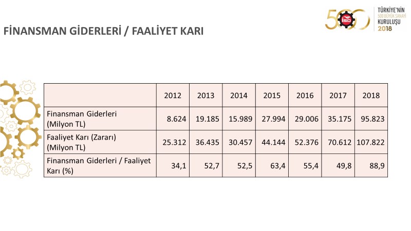 Yani, finansman giderleri sanayi firmalarının karlılıklarında temel belirleyici olmayı 2018 yılında da sürdürmüştür. İSO 500, 2018 yılında ani yaşanan finansal dalgalanma ve şokların yükselttiği finansman maliyetleri ile karşılaşmıştır. Yılın ikinci yarısındaki faiz oranları artışı ve Türk lirasındaki değer kaybına bağlı olarak enflasyondaki artışlar, İSO 500 için olumsuz mali koşullar yaratmıştır.