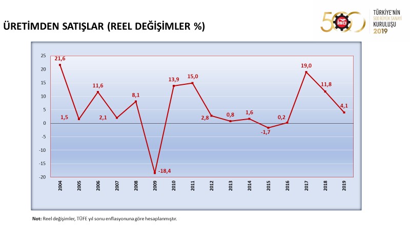 500 Büyük Sanayi Kuruluşu 2018 yılında 878 milyar lira olan üretimden satışlarını, 2019 yılında yüzde 16,4 oranında artırarak 1 trilyon liranın üzerine çıkarmıştır.