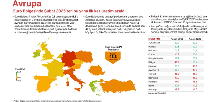 İmalat PMI kapsamındaki 33 ulusal ekonomi içerisinde aylık bazda büyüme kaydeden ülkelerin sayısı kasımda 17 iken aralık ayında 21'e yükseldi. 7 ülke daralmadan büyümeye, 3 ülke ise büyümeden daralmaya geçti. Raporun ayrıntıları şöyle: