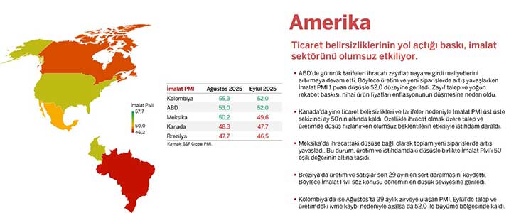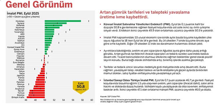 İstanbul Sanayi Odası (İSO), dünya İmalat PMI Eylül ayı gelişmeleri yayımlandı. Buna göre Küresel İmalat Satınalma Yöneticileri Endeksi (PMI), Eylül'de 0,1 puanlık hafif bir düşüşle 50,8'e geriledi. Buna rağmen faaliyet koşullarında üst üste ikinci ay ılımlı iyileşme sinyali verdi. Endeksin ikinci çeyrekte 49,9 olan ortalaması üçüncü çeyrekte 50,5'e yükseldi. Artan gümrük tarifelerinin ve talepteki yavaşlamanın üretime ivme kaybettirdiği vurgulanan raporun ayrıntıları şöyle: