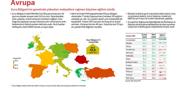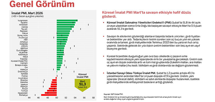 İstanbul Sanayi Odası (İSO), Dünya İmalat PMI mart ayı gelişmeleri yayımlandı. Küresel İmalat Satınalma Yöneticileri Endeksi® (PMI) Şubat'ta 51,8 ile 44 aylık zirveye ulaştıktan sonra Orta Doğu'da başlayan savaşın etkisiyle Mart'ta 0,5 puan azalarak 51,3'e geriledi. Raporun ayrıntıları şöyle: