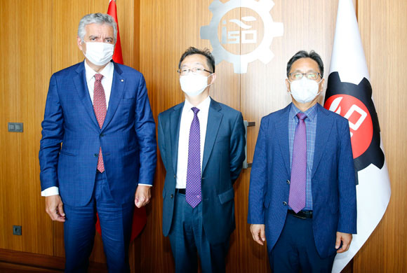 Kore Cumhuriyeti’nin İstanbul Başkonsolosu Sung-kyu Woo, İstanbul Sanayi Odası (İSO) Yönetim Kurulu Başkanı Erdal Bahçıvan’ı ziyaret etti. Odakule’deki ziyarette Başkonsolos Woo’ya Kore Ticaret Yatırım Teşvik Ajansı (KOTRA) İstanbul Ofisi Genel Direktörü Lee Dong-won da eşlik etti. Ziyarette iki ülke arasındaki iyi ilişkilerin ekonomik iş birliğine daha güçlü şekilde nasıl etki edeceği konusunda fikir alışverişi yapıldı. Görüşmede Koreli firmaların yüksek teknoloji konusundaki yetkinliği ile Türk sanayicilerin hangi alanlarda iş birliği yapılabileceği konuları da ele alındı.