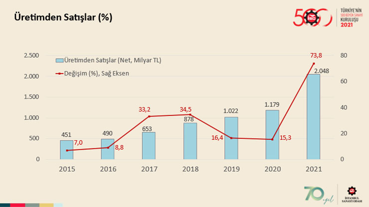 İSO 500’de üretimden satışlar, 2020’deki 1,2 trilyon lira olan seviyesinden, yüzde 73,8’lik artışla 2021 yılında 2 trilyon lirayı geçti. Artışın yüksek olmasında ihracattaki güçlü büyüme ile döviz kurları ve enflasyondaki hareketlenme etkili oldu.