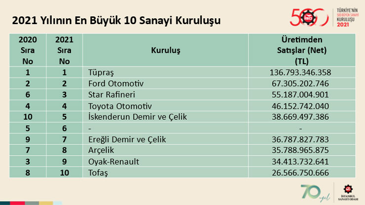 İSO 500 çalışmasında 2021 yılında üretimden satışlara göre en büyük kuruluşumuz 136,8 milyar liralık satışlarıyla Tüpraş oldu. Bu kuruluş uzun yıllardır sürdürdüğü liderliğini geçtiğimiz yılda da devam ettirdi.