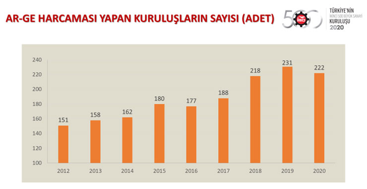 The number of companies performing R&D in the ICI Second Top 500 was 222 in 2020. Although there is a decrease compared to 2019, this number was the second highest ever measured. R&D activities are vital for the competitiveness of the industrial sector, and it is also an important finding that despite the challenging conditions in 2020, nearly half of the ICI Second Top 500 continued their R&D studies.