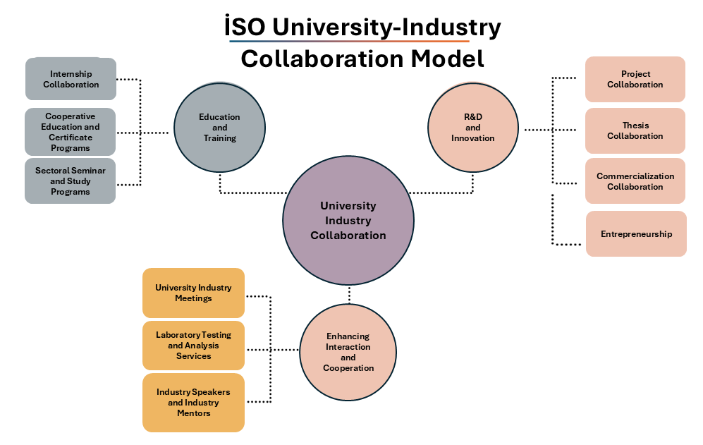 ISO places great importance on implementing university–industry collaboration (UIC) through concrete projects to enhance the competitiveness of industry. In line with this approach, it encourages its members to benefit from support programs related to university–industry collaboration and develops high value-added partnerships with universities in order to address the flow of knowledge and technology between academia and industry through an institutional and systematic approach.